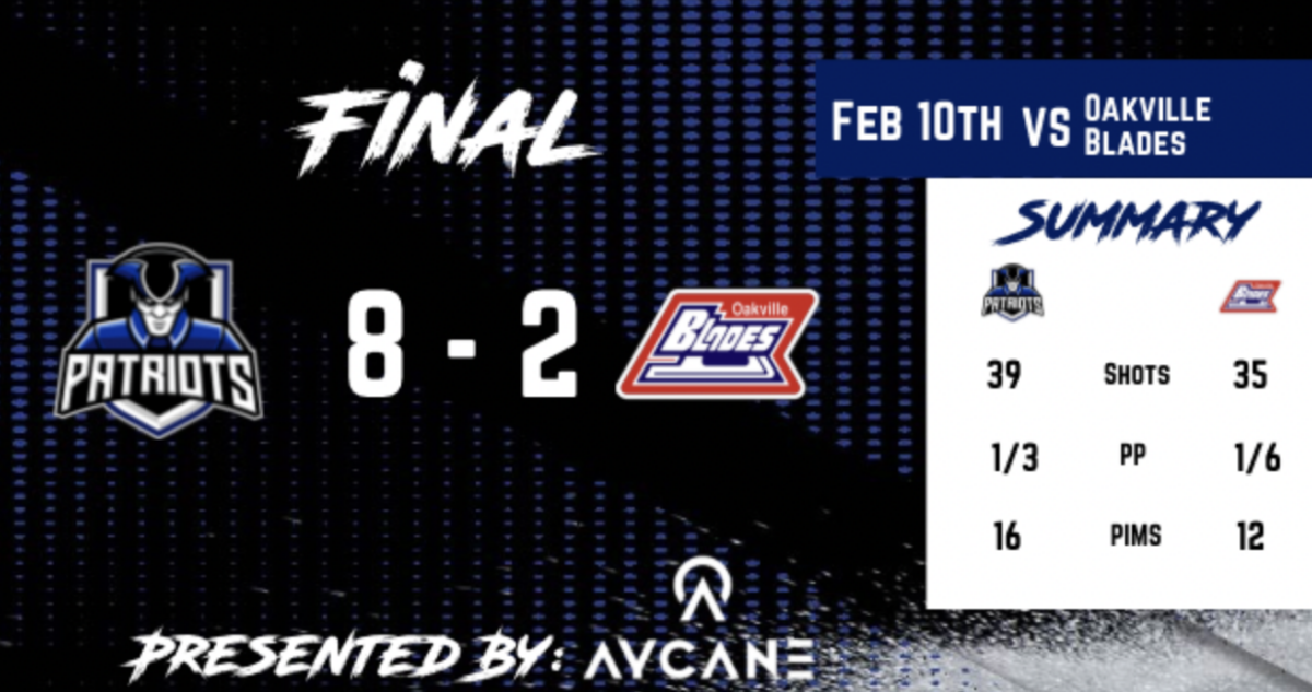 The win marks the Patriots’ 41st of the season as they now turn their attention to a Friday night matchup with the Leamington Flyers.8-2
